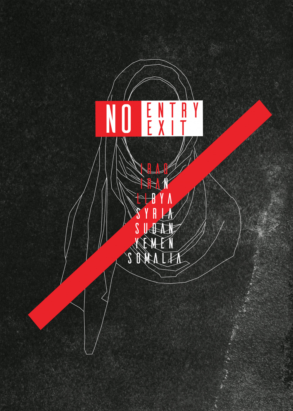 This concept is based on the Muslim ban that was signed off by President Trump of The United States of America were 7 countries were banned from travelling to America. The poster describes how Muslims must feel. It is hard enough for them to leave their countries, others even leave illegally and it is also hard for them to get into a safe country so they end up being stuck between a rock and a hard place. In essence, for Muslims, there is no entry and there isn't an exit either .