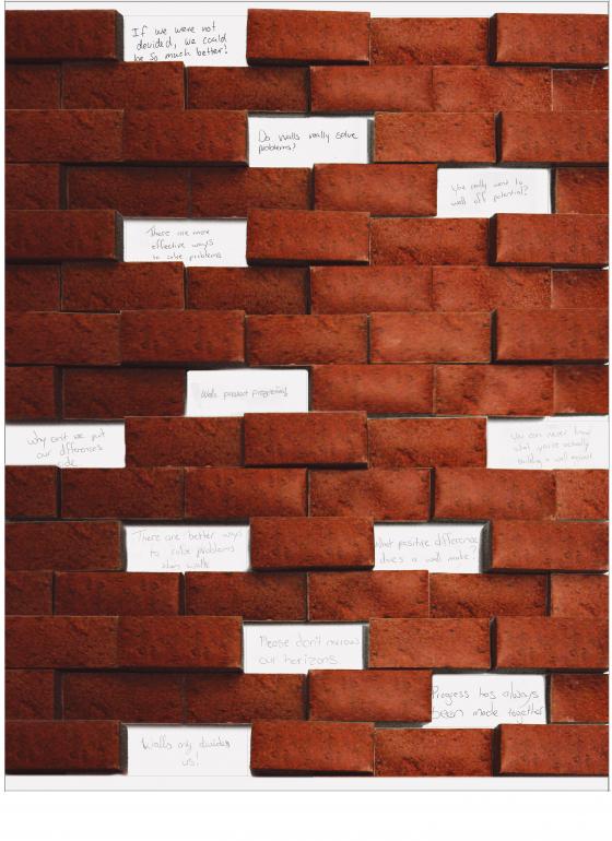 This is an interactive poster, where people can take out bricks and read letters from people on the other side of the wall. It could also be set up in such a way that you have to sign a petition for the wall not to be built when you take a brick.