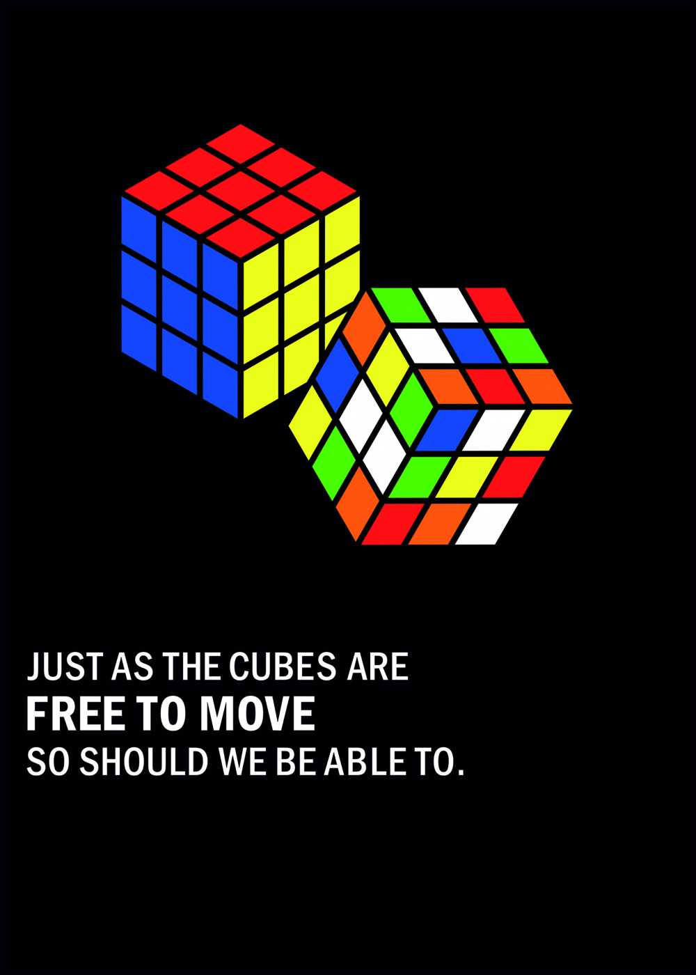 The cubes are a metaphor for how people should be able to move and not be restricted in one place or area.