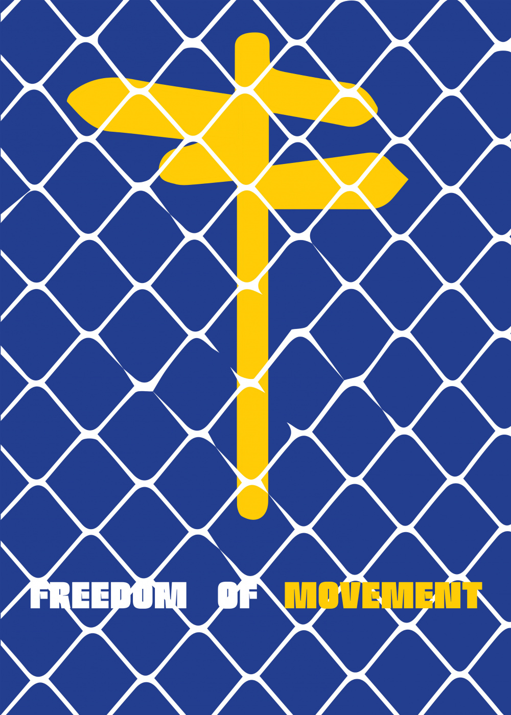 The design uses the colors of the EU flag to associate with freedom. The crossroads shows the idea that everyone can go where they wish and explore new roads and countries. The barbed wire expresses the paradox that even though you are free to move in theory, there are restrictions depending on your nationality.