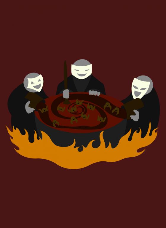 Unidentified corrupt political figures and personified 'fake news', wearing benign masks hiding their true malicious intentions. They are working together by stirring the public into a frenzy. The blazing fire engulfing everything alludes to the phrase, "Liar, liar, pants on fire."