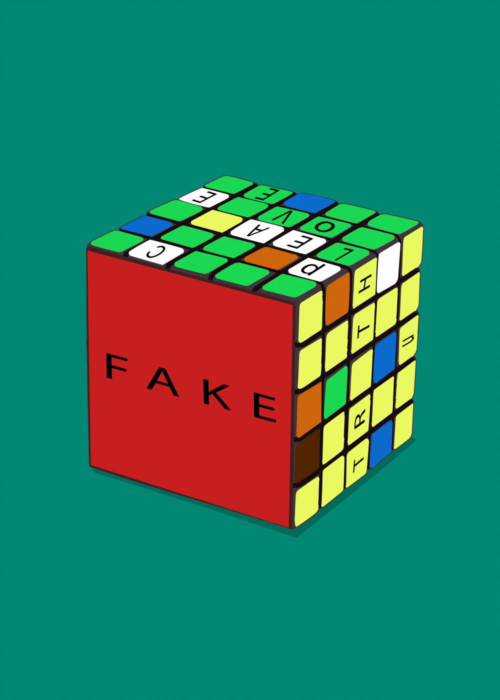 Fake news makes   The ideals that exist in life for human beings Be forgotten And it becomes impossible to reach them. In this plan Rubik's Cube The red side is locked   It is not possible to rotate it In this locked part, the title of the forgery is written And it is fixed and affects the rest of the writing. In the green part, the word love is written It is written in the white part of peace In the yellow part, the truth is written The writing in white, green, and yellow is cluttered