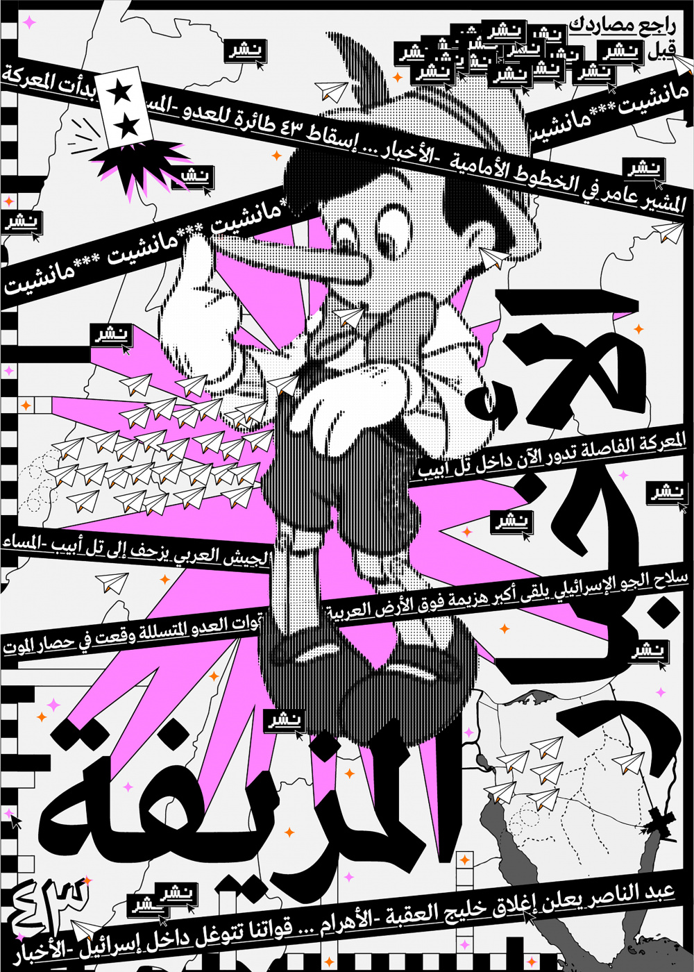 The portrayal of the Six-Day War in 1967 is one of the biggest lies in Egypt's history. The press and media outlets were announcing Egypt's incredible victories while in reality Egypt was losing the war. The shock of losing the war and losing Sinai was even more severe because of the news' glorification of Egypt's fake victories and people thought the country was winning. The poster includes some of the newspapers' headlines at the time.