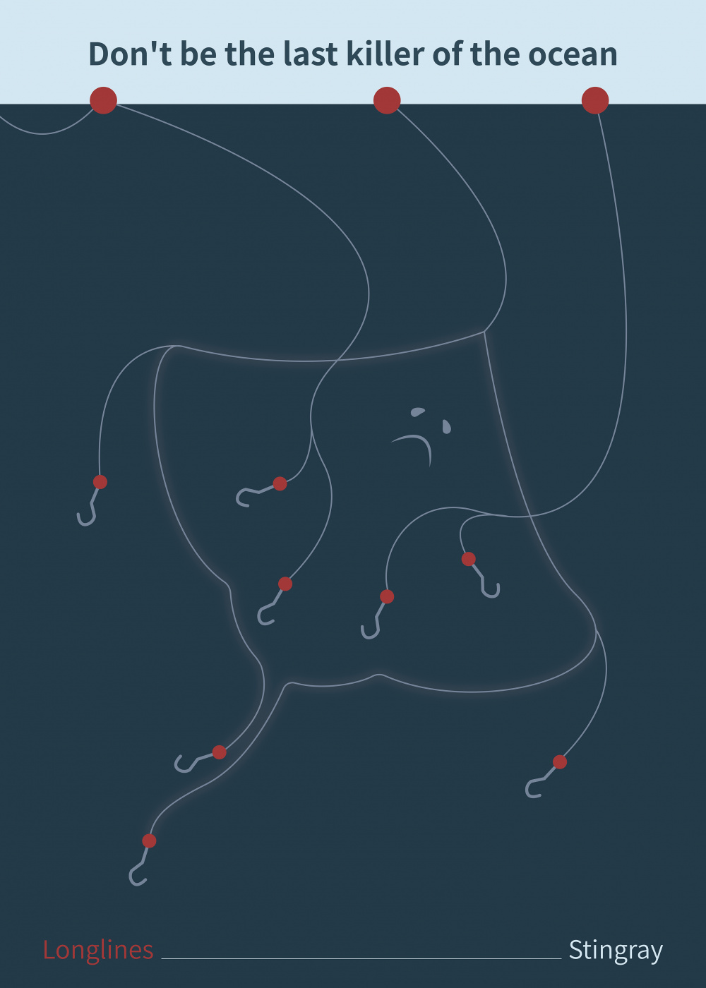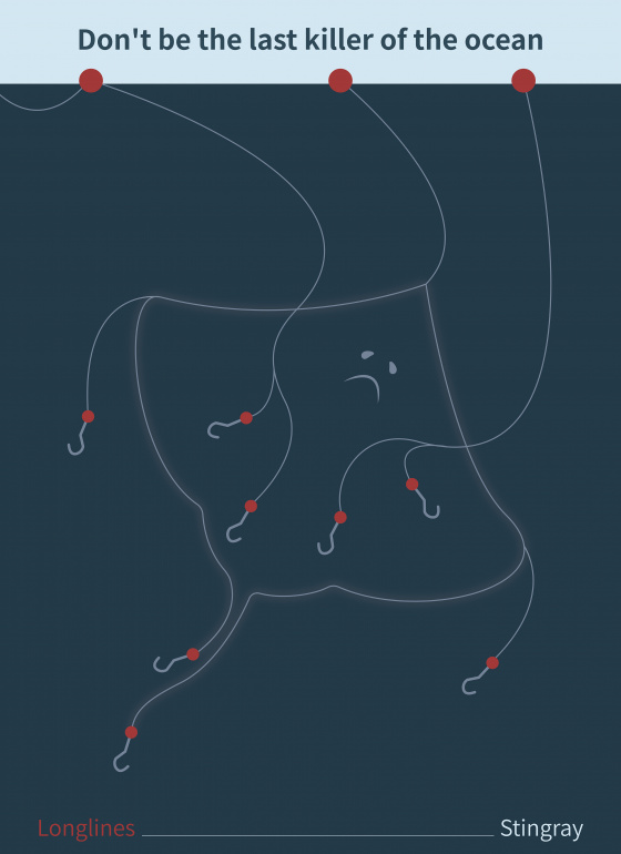 In recent years, many marine species have been overfished, which leads to the decrease of fish resources. What’s worse, more and more fish is under threat of extinction. In this poster, longlines outline the shapes of a stingray, which may motivate modern people to put more emphasis on the issues of fish resources.