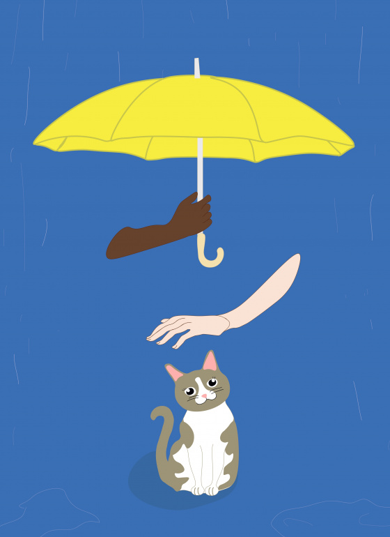 Kediyi yağmurdan korumak isteyen bir el ve ikisini de kormak içim şemsiye uzatan bir el.