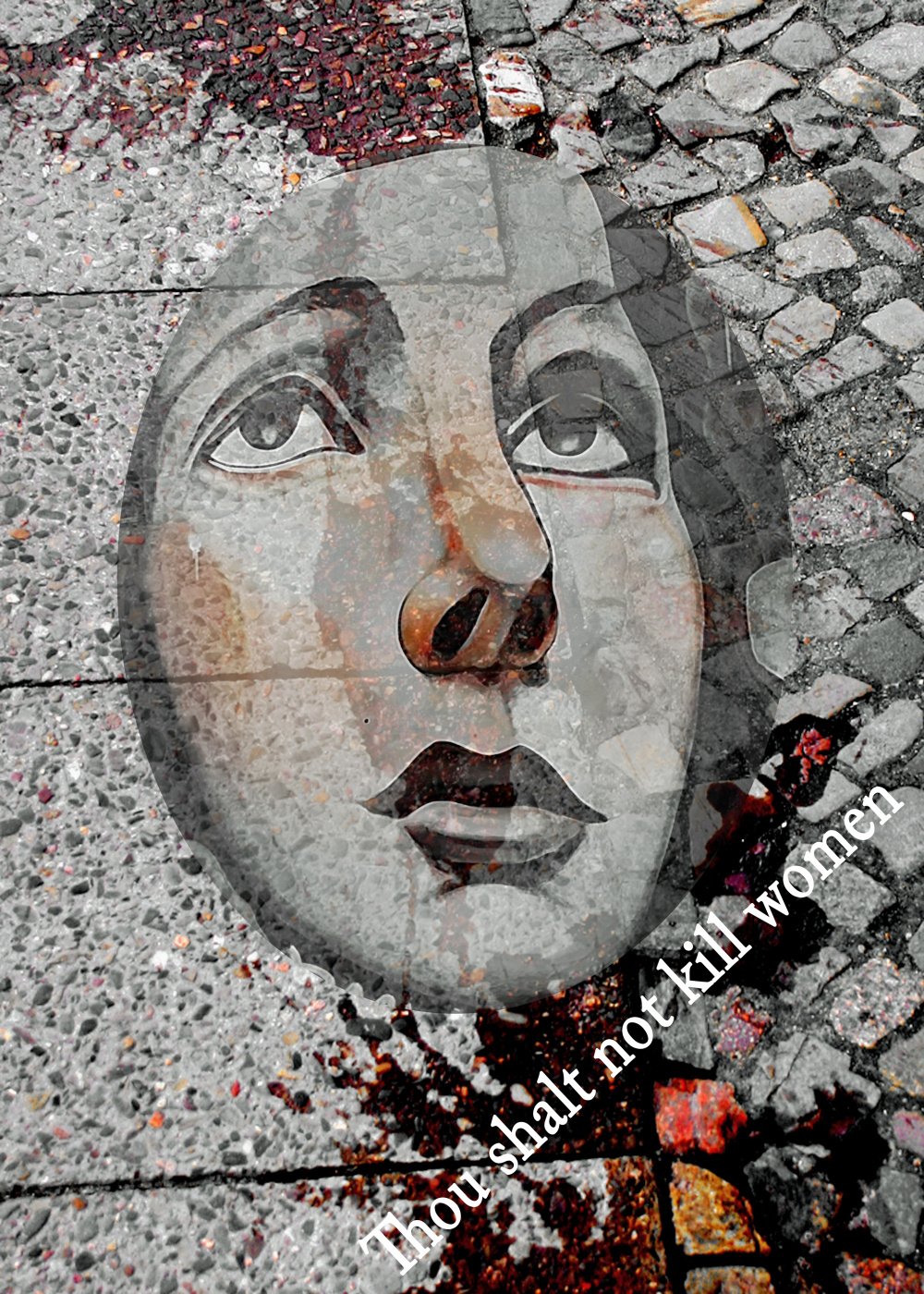 Here the motif contains a text in the form of a commitment and an obligation. The background with the blood stains is a real photo. The woman's face is a painted portrait and in the stage of fading. The memory about women who have fallen victim to femicide often fades away.